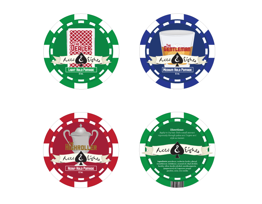 The name Aces & Eights was chosen to play off of the legendary “dead mans hand” in poker as well as create a theme that fit in but also was unique unto itself. The gambling theme fit in with resurgence of the vintage styling while also being very masculine. Being that there were three separate products, the names were created to chronicle the various people that would be seen at a poker table.