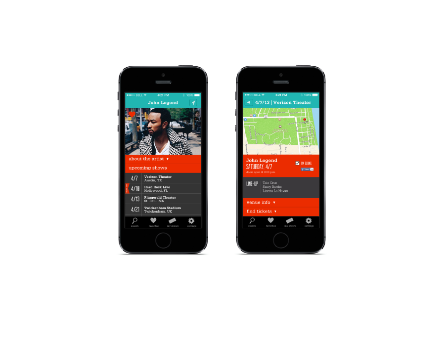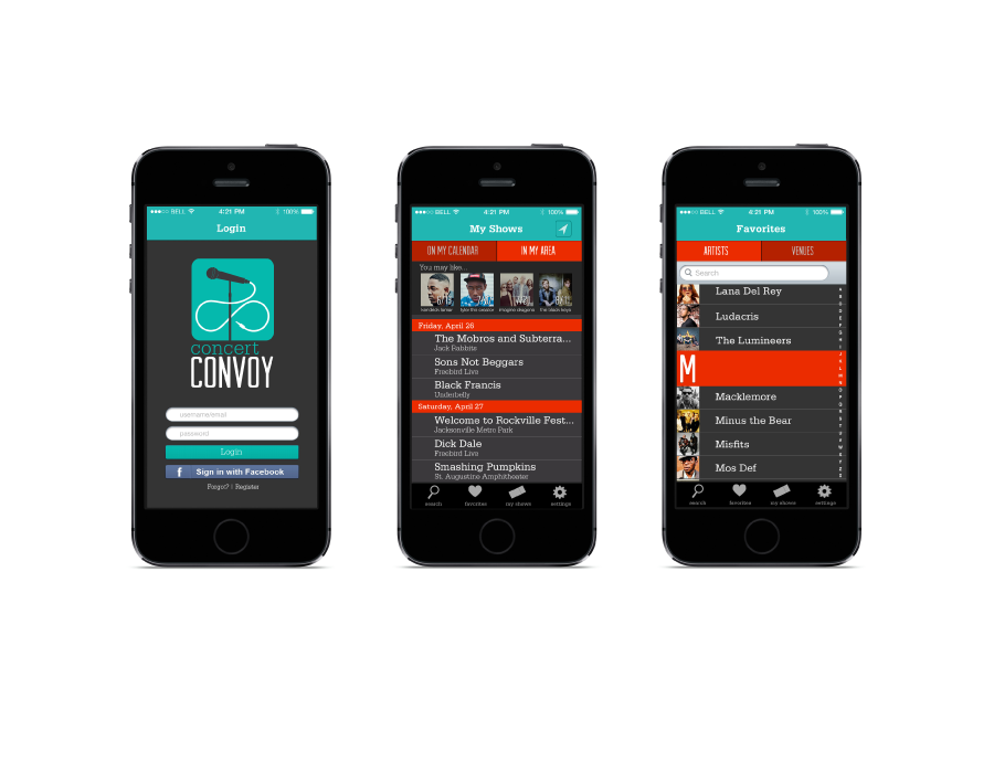 Concert Convoy is a mock concert finding app. The idea was to create a dark app that had pops of color, much like being at a concert. Concert Convoy allows the user to connect with Facebook and track artists they already are familiar with, as well as allowing the user to favorite local venues to see what‘s going on locally to perhaps check out an artist they aren‘t as familiar with if they‘re in the mood.